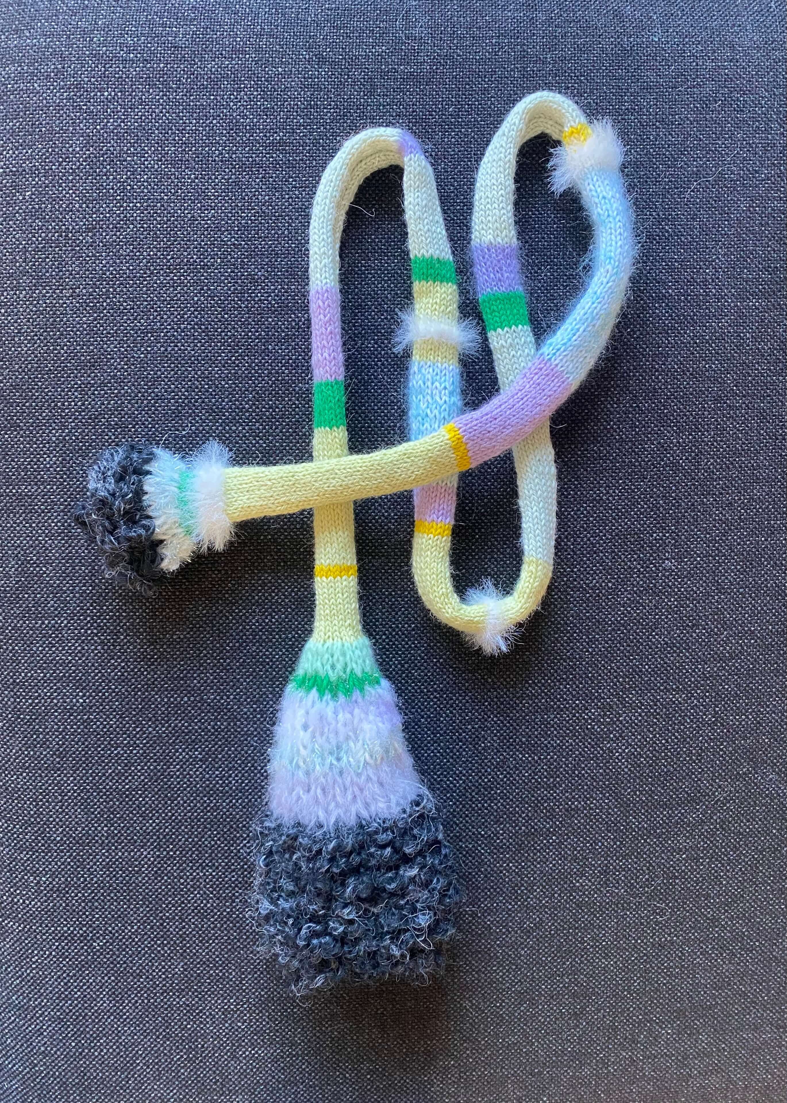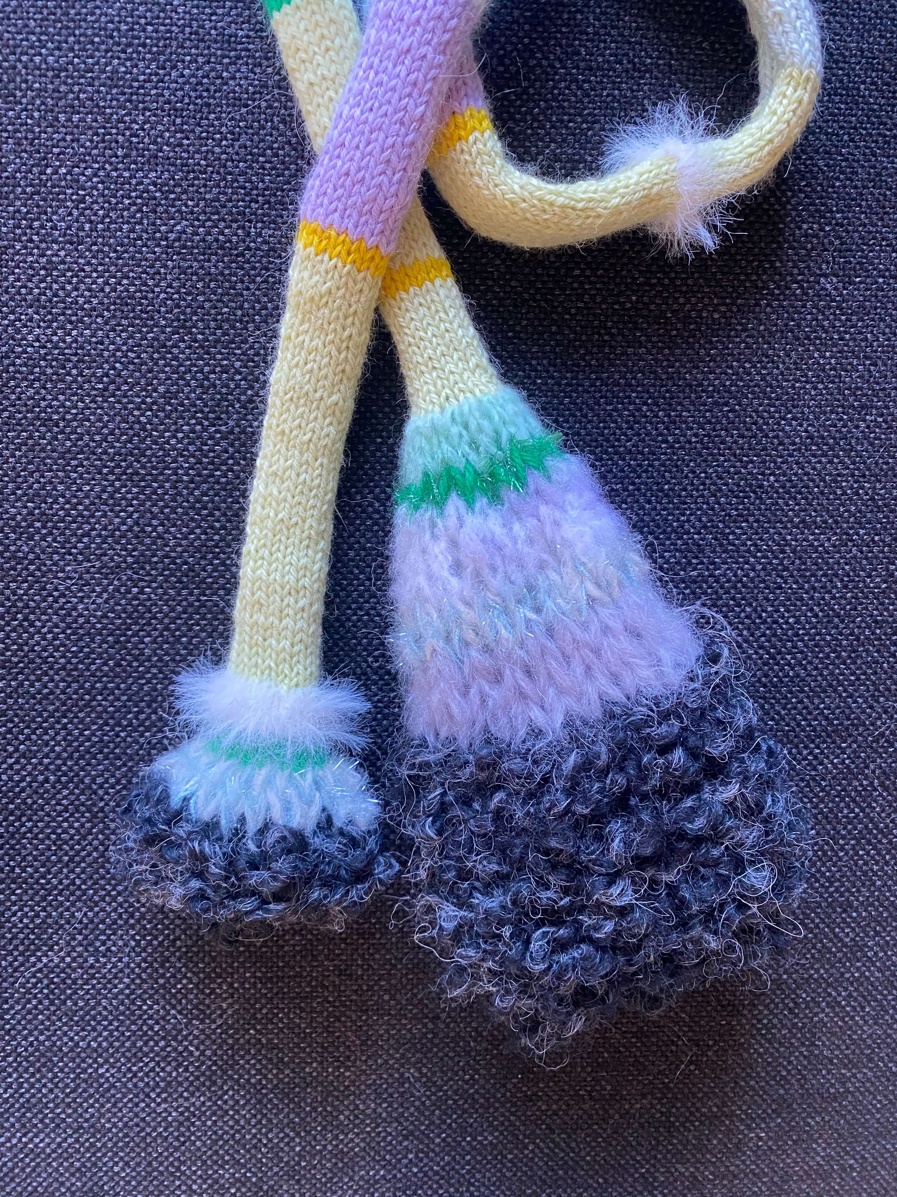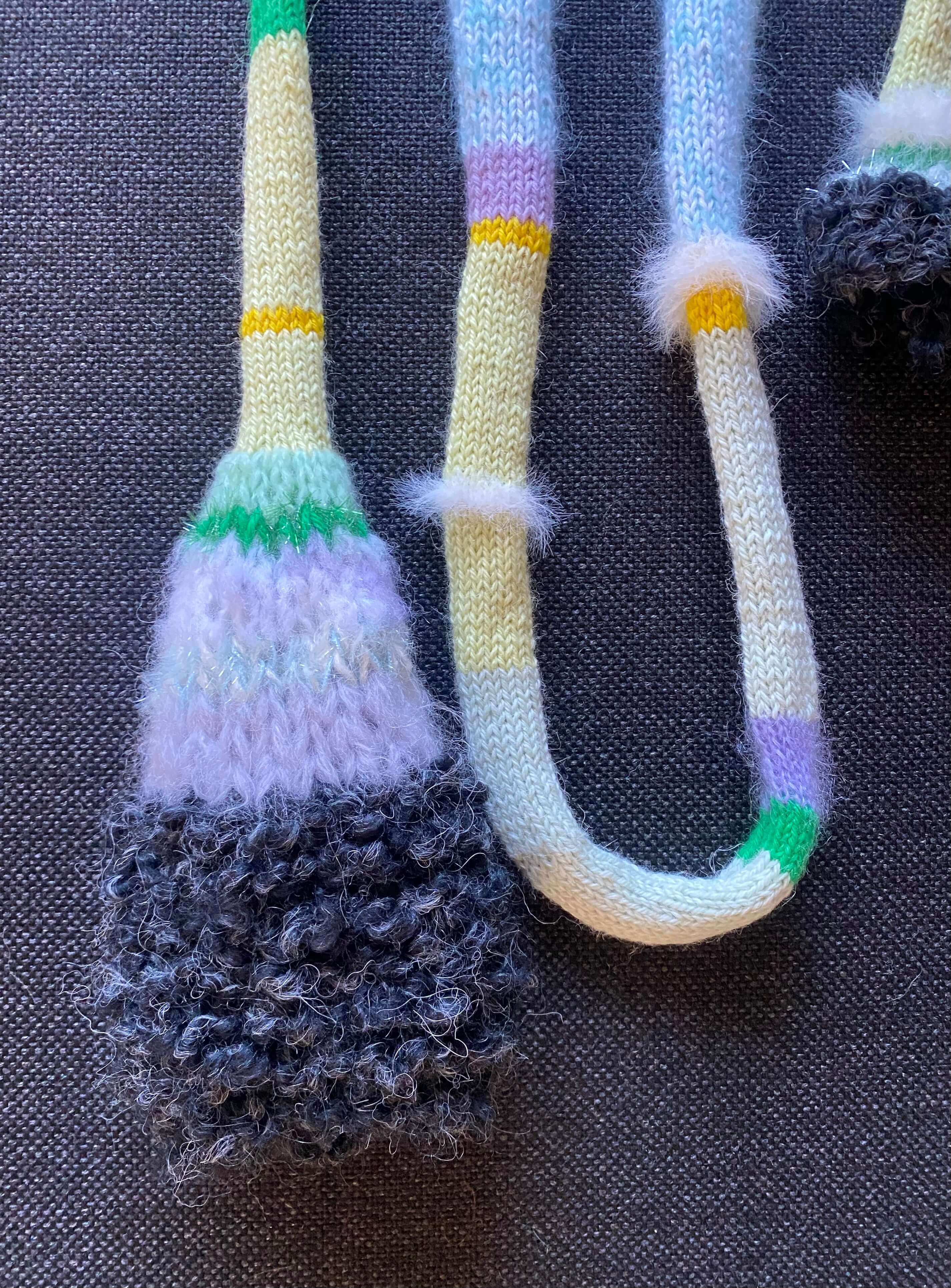 Innimellom er det striper av Plum (70 % super kid mohair) fra Rauma Ullvare, PT5 (80 % ull, 20 % nylon) fra Rauma Ullvare