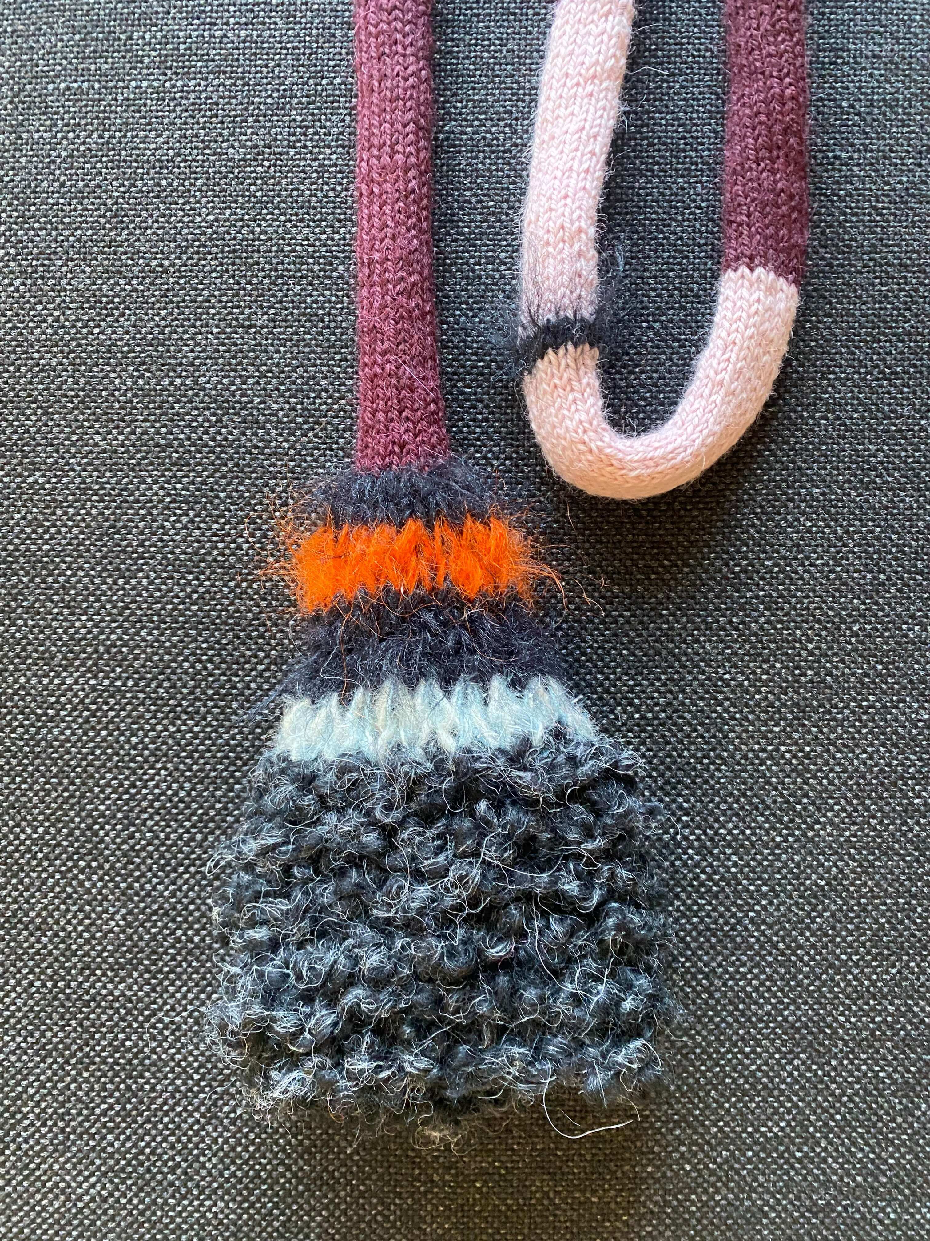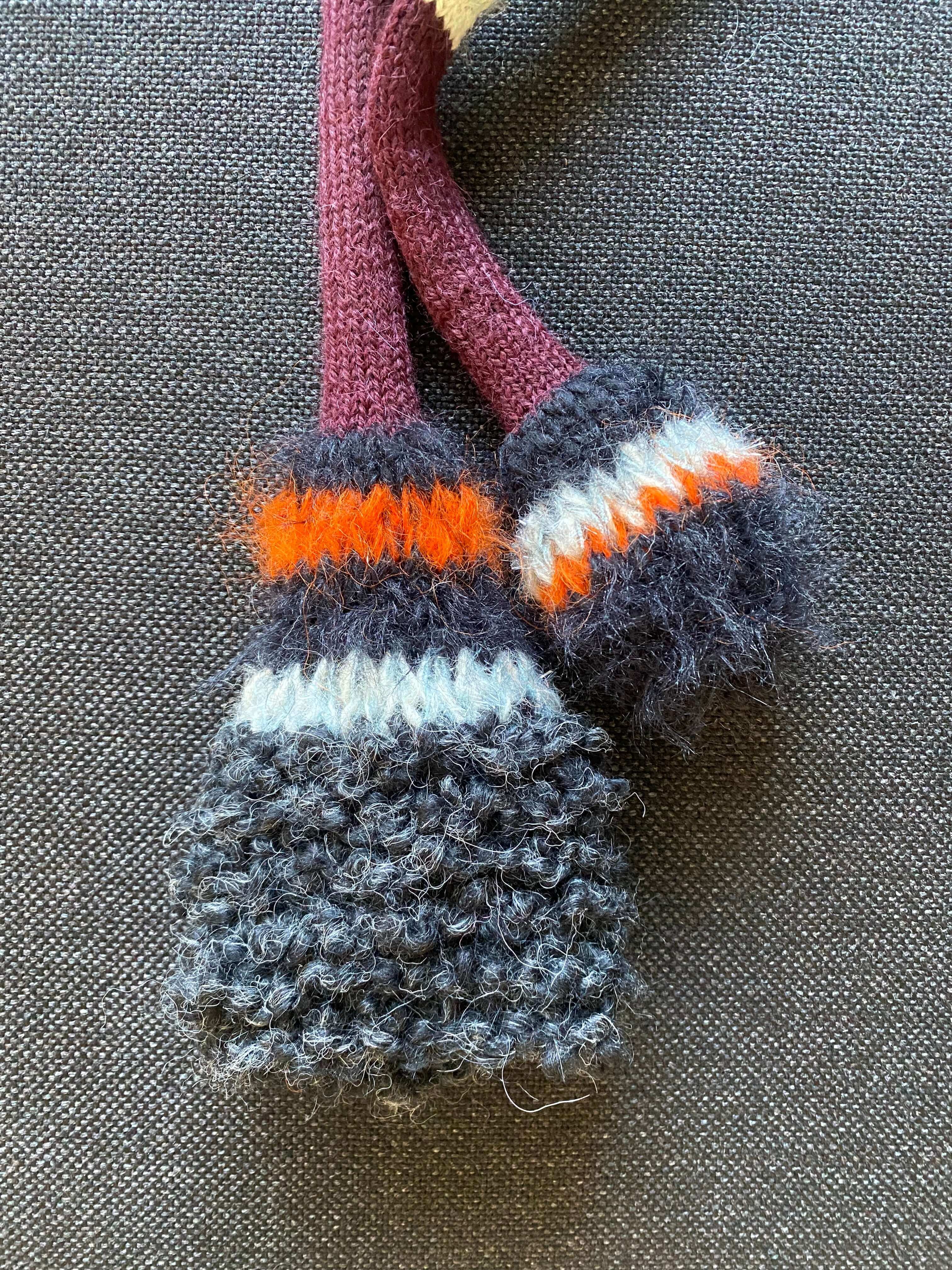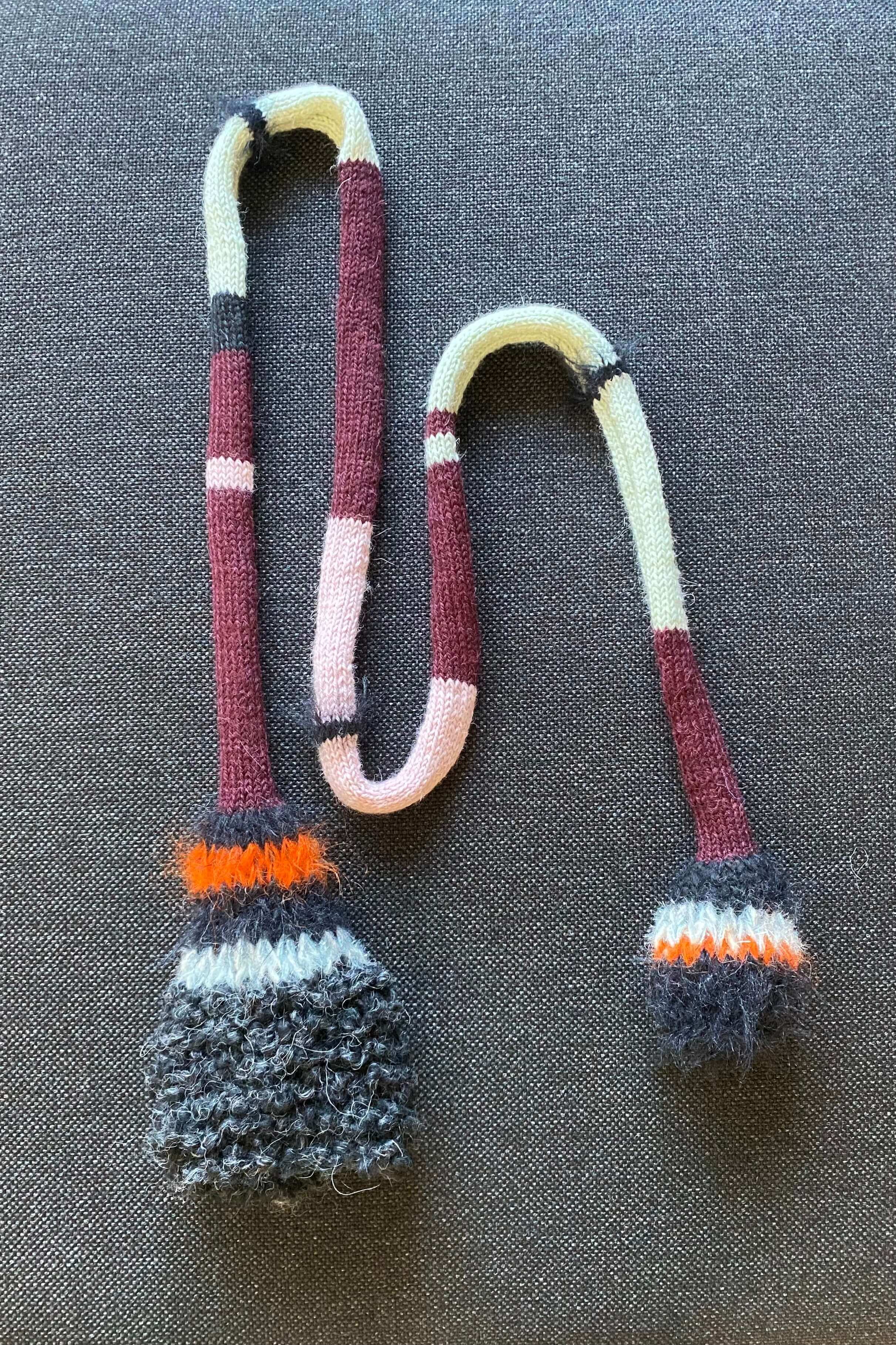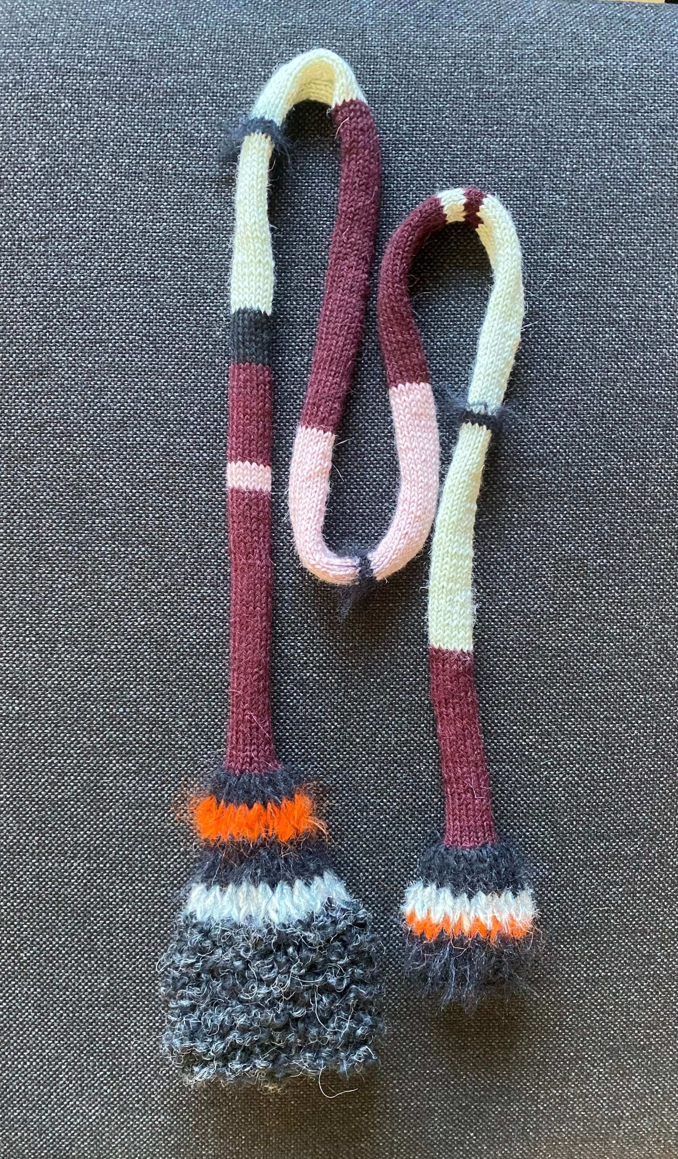 Stripet smalt skjerf i svart og burgunder med effektgarn i begge ender